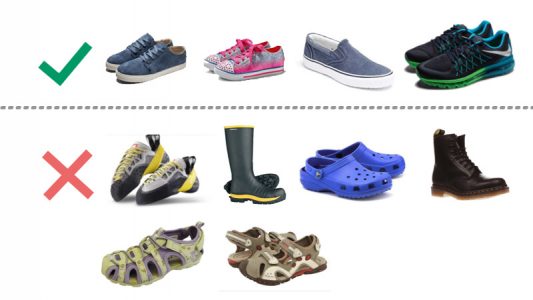 Open toed shoes, flip flops, boots, crocs, rock shoes or heels are not permitted in the climbing arena.